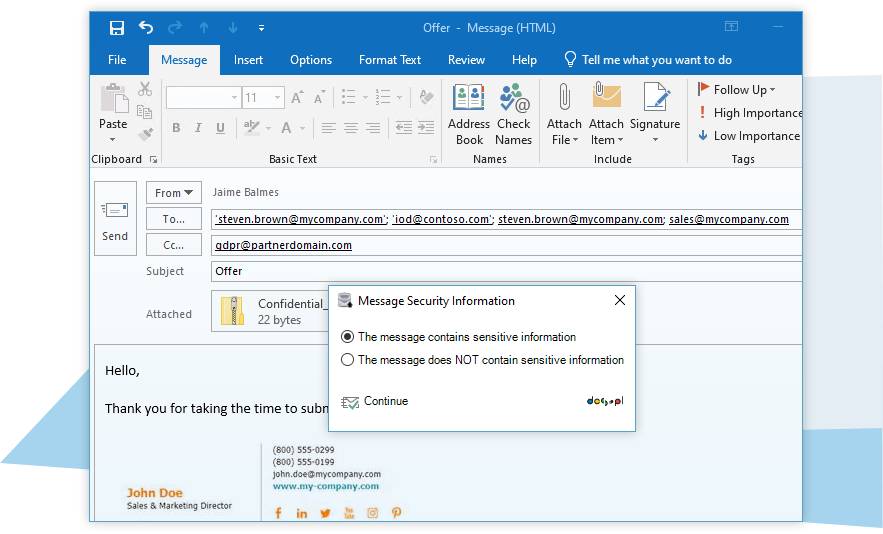 Use SendTrusted in Microsoft Outlook to confirm recipients are authorized for sensitive emails (internal and external). SendTrusted can also check (RegEx) email's body or/and subject to make sure sensitive data does not leave your company.